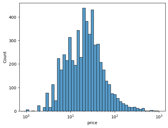 Follow me reading the plot from left to right: there’s a very small quantity of products priced 1 and 2 euros, and products priced 3, 3.5 and 4 euros get to around 200 items in total. Products count keeps on growing with price 5 to 9 euros but remains relatively low, slightly above 200 items. When we get to 10 euros we meet the first peek: notice that 10 as an exact price is at the end of its own spike, with products most probably price 9.99 taking over the spike range. More than 300 products are price 10 euros. The range between 10 and 20 euros is very dense of products, with another peak before the 20 euros mark. At 20 euros we have the highest peak of the distribution, called mode, which represents the most common price in the catalogue, with a quantity of more than 400 products with this price. Between 20 and 30 euros we stay up with products count, close to 400 and never below 300. At 30 euros we have the second highest peak again with more than 400 items. After 30 euros, products count starts decreasing, getting back to 100 items with a 100 euro price.