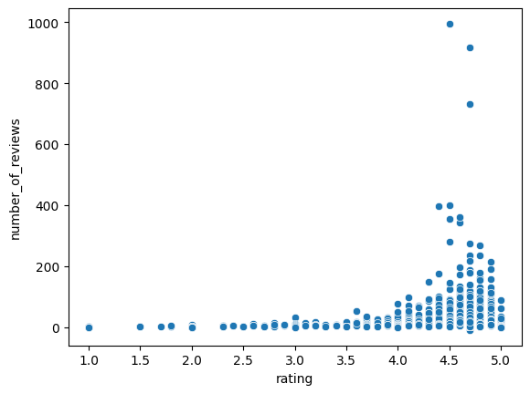 This scatterplot shows the relationship between Rating as independent variable and Number of Reviews as dependent variable. While there is no relationship between the two variables, we can still make some comments.